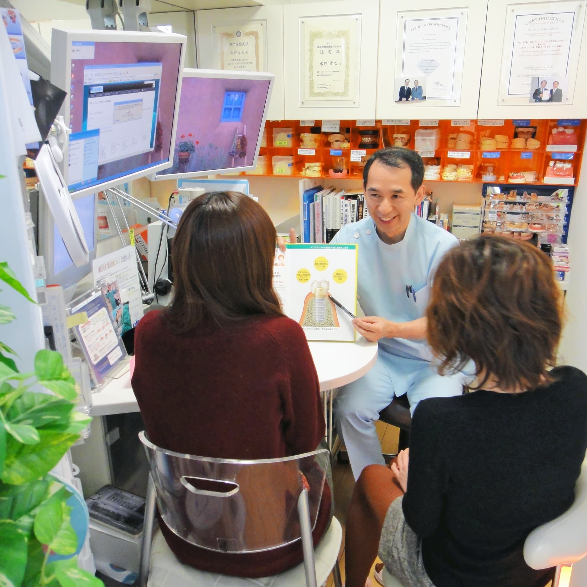 当院では、歯石除去などのクリーニングはもちろんの事、次亜塩素酸による滅菌や、薬による治療など、様々な対処方があるなか、適切な処置を選び歯周病を治療し、インプラント処置にはいります。