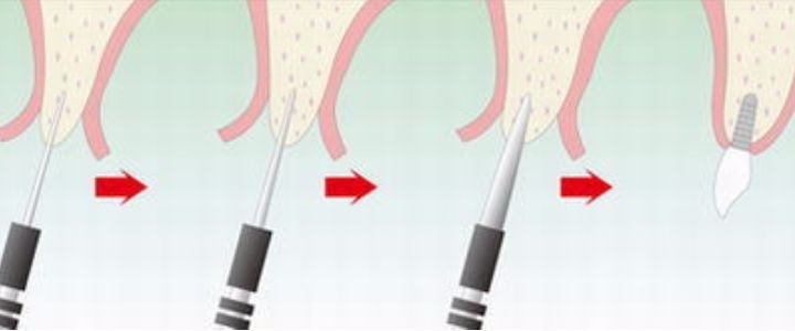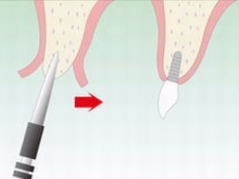 通常処置は、歯茎を切り開き、ドリルで穴をあけてインプラントを埋入します。